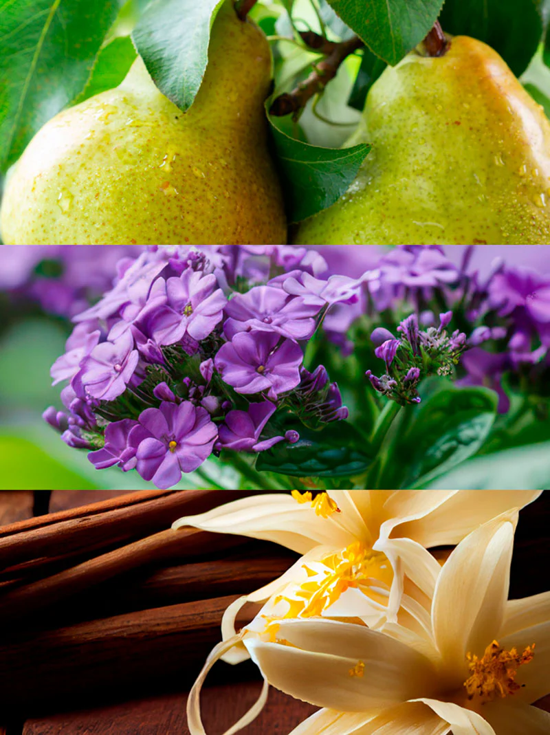 Już od pierwszych chwil wyczuwalna jest gruszka, nadająca kompozycji lekkiej, owocowej słodyczy i świeżości. W sercu zapachu pojawia się heliotrop, który wnosi pudrowy, lekko migdałowy akcent, dodając całości miękkości i wyjątkowego, kobiecego charakteru. Bazę stanowi białe piżmo, które otula zapach, nadając mu czystości, trwałości i subtelnego, zmysłowego wykończenia.