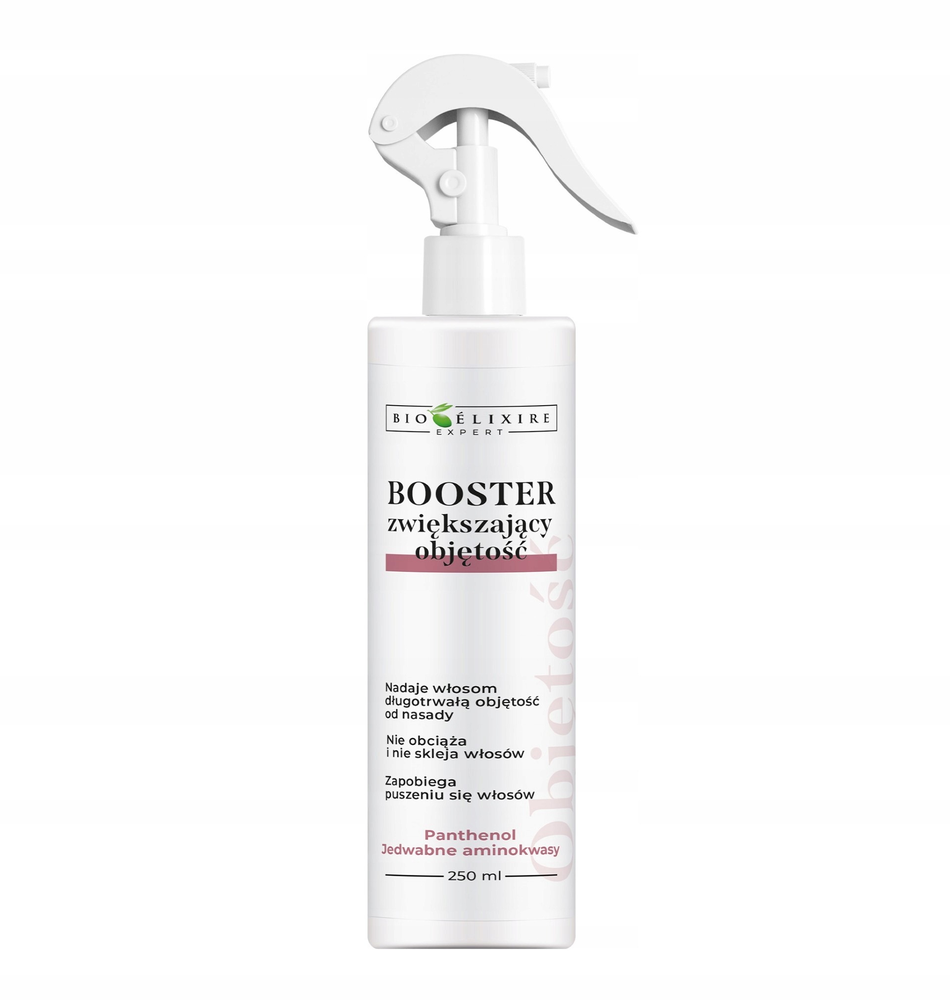 Booster od Bioelixire to doskonały produkt dla włosów cienkich, delikatnych, pozbawionych elastyczności, tzw „przyklapniętch”. Booster posiada niezwykle lekką formułę, dzięki czemu nie obciąża włosów a jednocześnie doskonale unosi włosy od nasady i widocznie zwiększa ich objętość. Wzbogacony w jedwabne aminokwasy, które wzmacniają włosy oraz zwiększają ich odporność na uszkodzenia mechaniczne i termiczne. Booster przywraca naturalną elastyczność, miękkość i połysk. Włosy nabierają zdrowego wyglądu.