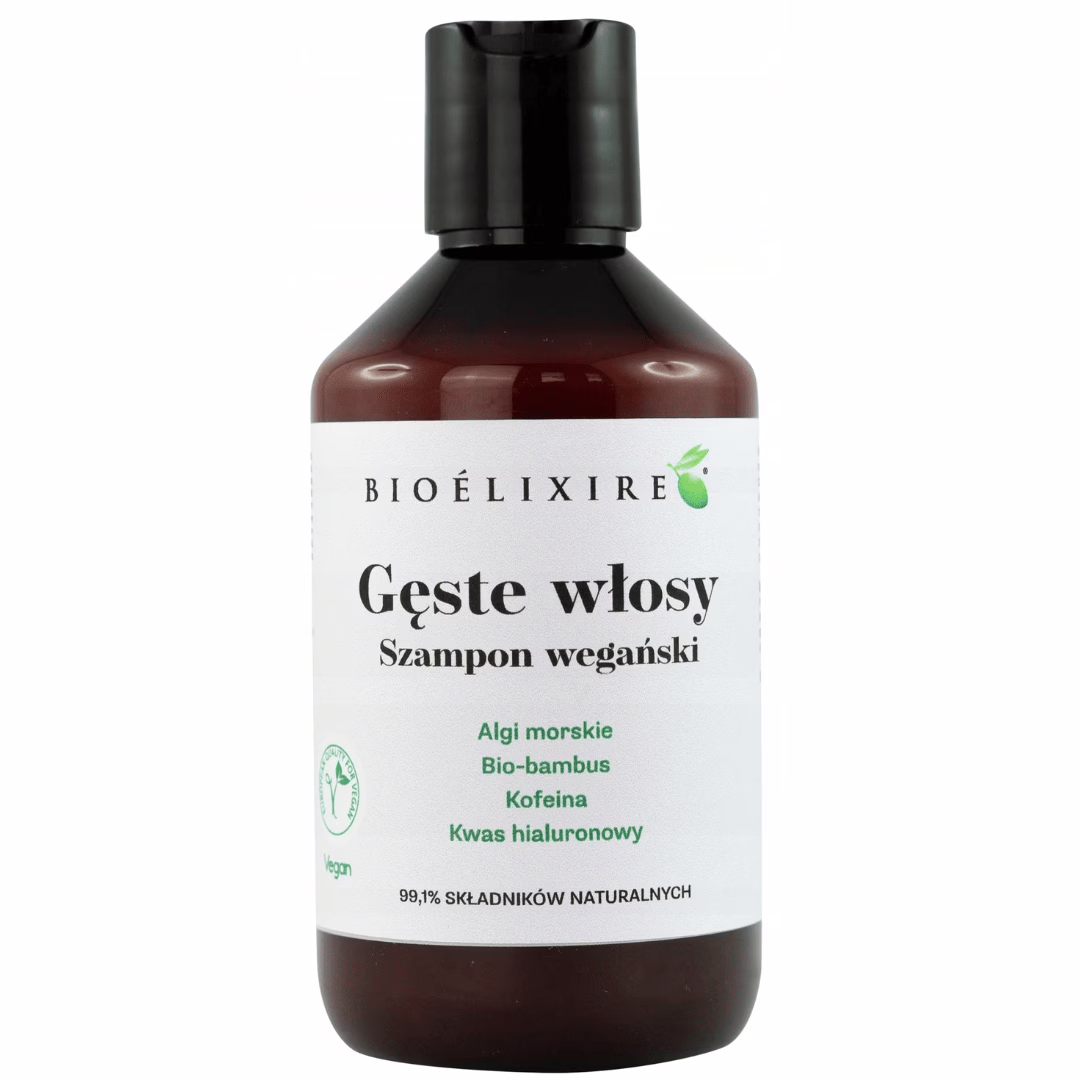 Szampon Gęste Włosy w 99,1% naturalny i 100% wegański wolny od SLS, wolny od parabenów i silikonów. Nowoczesna, średniej mocy formuła wykorzystująca wzmacniające działanie alg morskich i bio-bambusa. Jego działanie skupione jest na zachowaniu filmu ochronnego skóry głowy, łagodzeniu podrażnień i na wzmacnianiu struktury włosów. Kluczową rolą szamponu jest usunięcie pozostałości stylizacyjnych, nadmiaru sebum oraz zanieczyszczeń środowiska. Szampon jest wstępem do kuracji wspierającej porost włosów i poprawiającej ich kondycję.