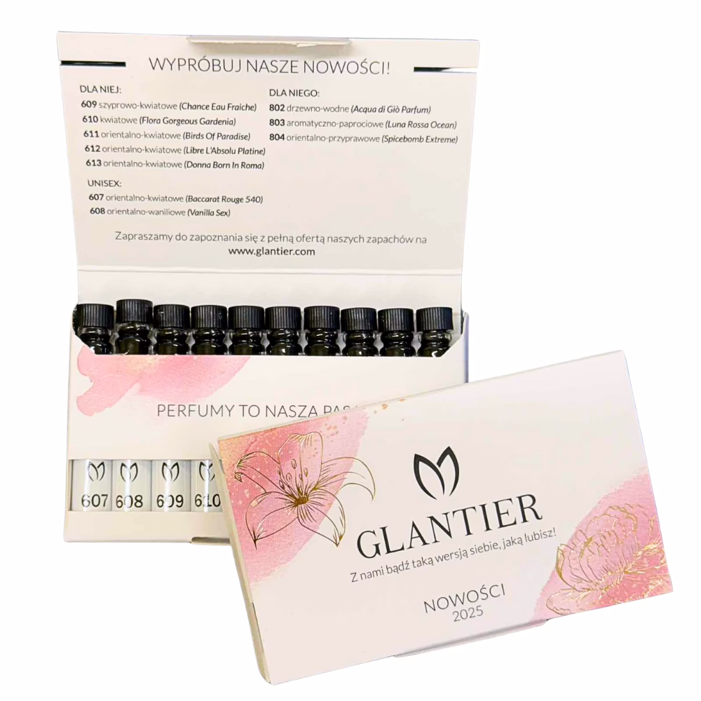 Poznaj świat najświeższych zapachowych inspiracji z pakietem próbek, który prezentuje 10 premierowych kompozycji Glantier na rok 2025. Wśród nich znajdziesz perfumy unisex, damskie i męskie – wszystkie starannie dobrane, aby dać Ci możliwość odkrywania zupełnie nowych aromatów, dopasowanych do różnych okazji, pór dnia i nastrojów.