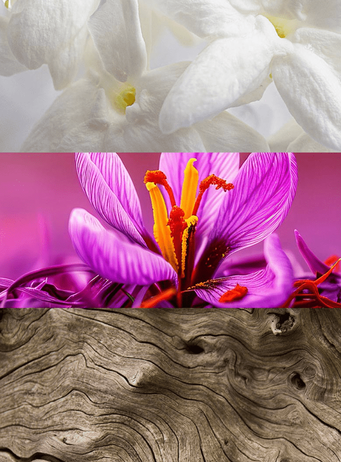 Otwarcie zapachu buduje jaśmin, nadający kompozycji subtelnej świetlistości i kwiatowej elegancji. W sercu pojawia się szafran, który wnosi orientalny, lekko pikantny akcent, dodając całości głębi i charakteru. Bazę stanowi drewno cedrowe, zapewniające trwałość oraz ciepłe, drzewne wykończenie, które pięknie rozwija się na skórze.