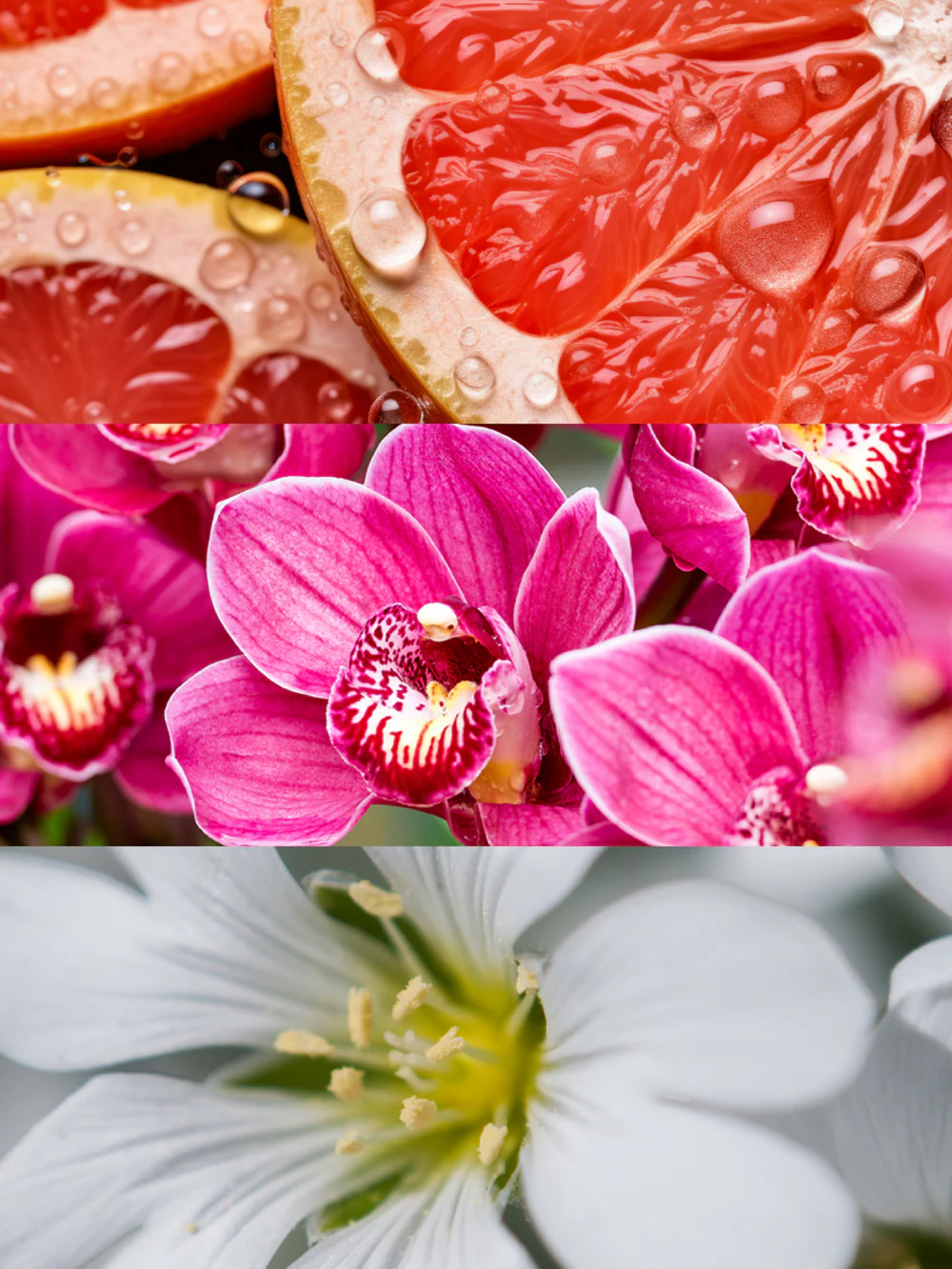 Już od pierwszych chwil wyczuwalne jest pomelo czerwony rubin, które wnosi soczystą, cytrusową świeżość i orzeźwiającą energię. W sercu zapachu rozwija się orchidea cymbidium, dodająca kompozycji subtelnej, kwiatowej elegancji. Bazę stanowi piżmo, które otula całość delikatnym, czystym i niezwykle kobiecym akcentem, zapewniając trwałość i harmonijne wykończenie.