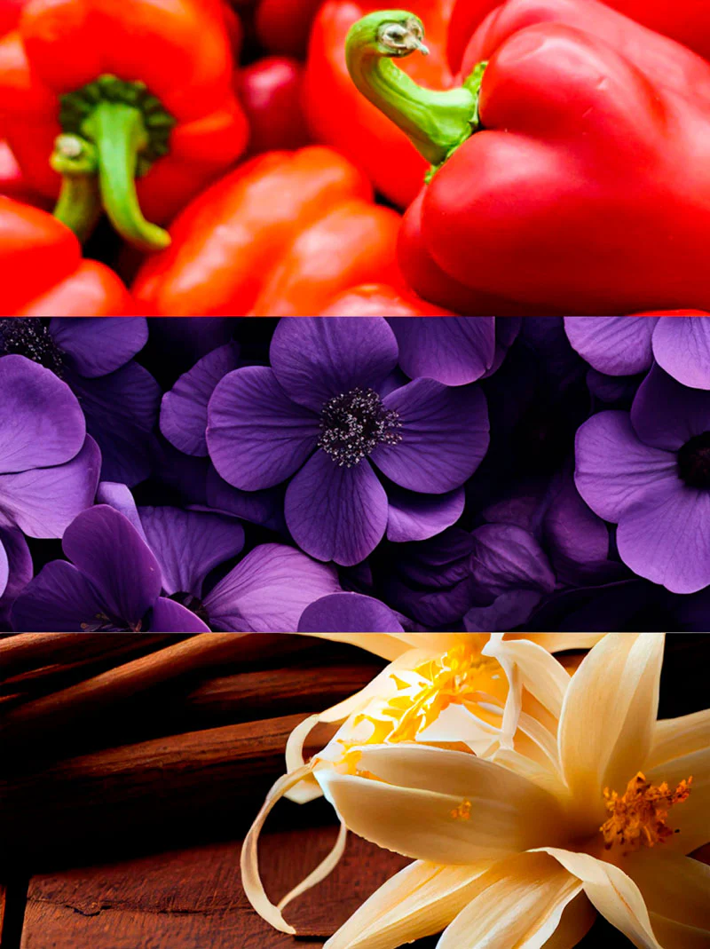 Już od pierwszych chwil wyczuwalny jest pieprz, który wnosi lekko pikantny, pobudzający i nieoczywisty akcent. W sercu zapachu rozwija się fiołek, nadający kompozycji pudrowej miękkości oraz subtelnej elegancji. Bazę stanowi wanilia, która otula całość ciepłą, słodką i zmysłową nutą, zapewniając trwałość i harmonijne wykończenie.