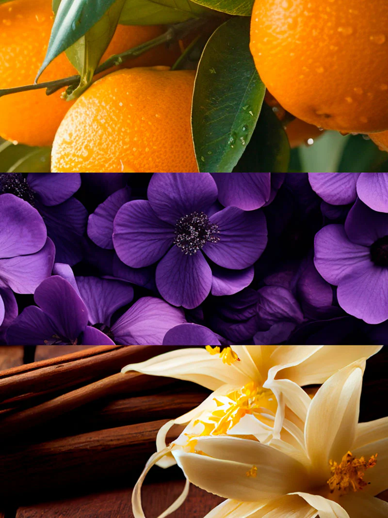 Już od pierwszych chwil wyczuwalna jest mandarynka sycylijska, która nadaje zapachowi świeżości i energetycznego, lekko słodkiego akcentu. W sercu kompozycji pojawia się fiołek, wprowadzający elegancki, delikatnie pudrowy charakter i wyrafinowaną głębię. Całość dopełnia wanilia, która w bazie nadaje kompozycji ciepła, słodyczy i zmysłowego wykończenia, sprawiając, że zapach długo utrzymuje się na skórze.