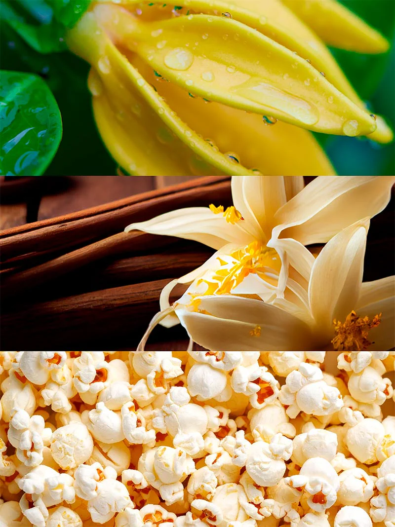 Już od pierwszych chwil wyczuwalny jest ylang-ylang, który wnosi egzotyczny, kremowy i kobiecy akcent. W sercu zapachu rozwija się wanilia, nadająca kompozycji ciepła, słodyczy i otulającej zmysłowości. Bazę stanowi popcorn, który dodaje całości oryginalnego, lekko karmelowego i uzależniającego charakteru.