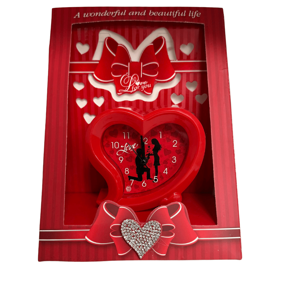 Wyjątkowy zegar w kształcie serca to idealne połączenie funkcjonalności i romantycznego designu. Umieszczony w eleganckim, ozdobnym pudełku w odcieniach czerwieni, od razu przyciąga wzrok i wzbudza emocje. Centralnym elementem zegara jest motyw zakochanej pary, który pięknie podkreśla symbolikę miłości, bliskości i wspólnego czasu.
